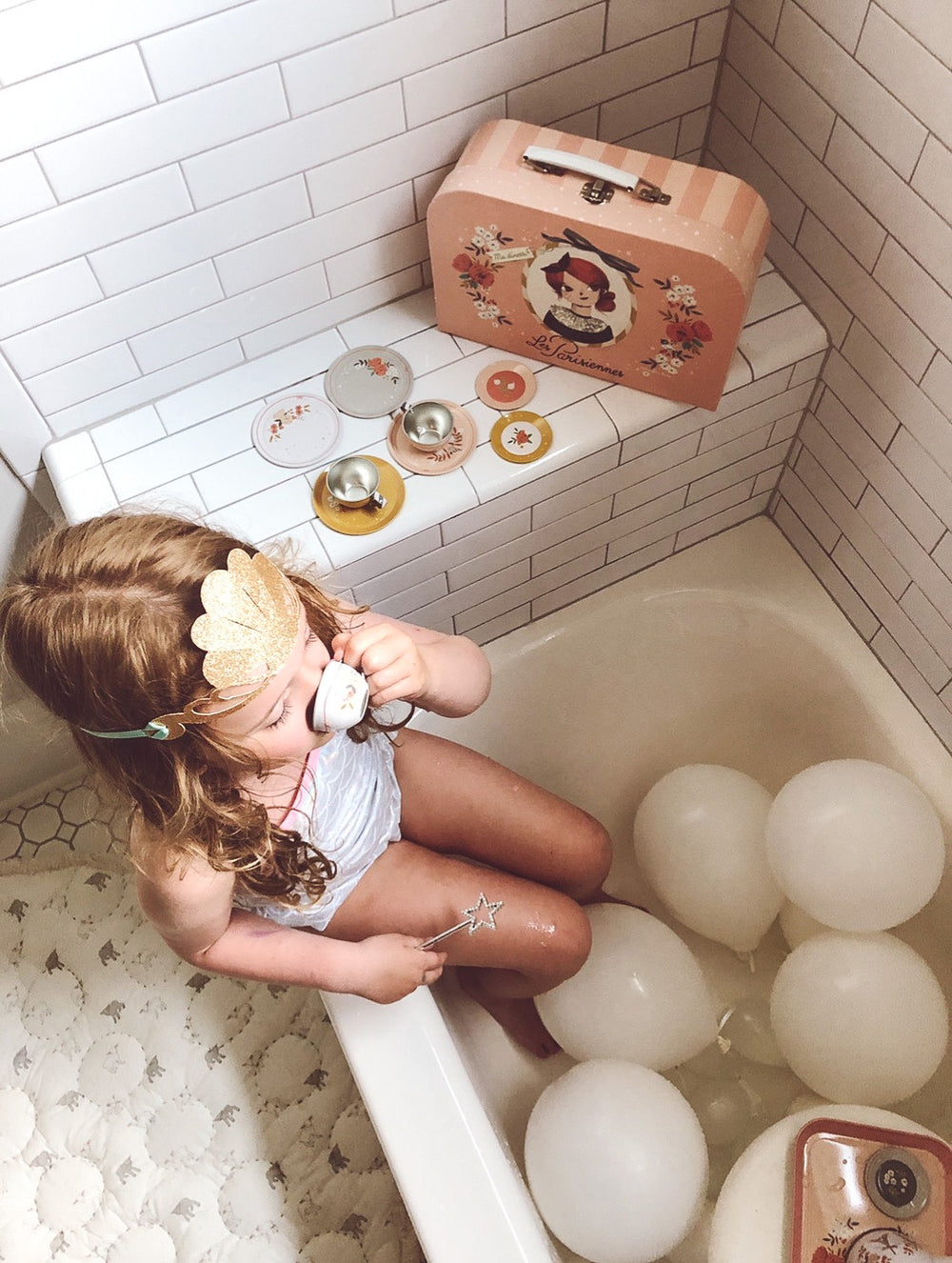 We recently received the most darling Moulin Roty tea set from our friends at Rose and Rex, which called for a tea party (duh). But what kind of tea party? I thought about a traditional one, with a little table and chairs and maybe some macarons and some stuffed animal friends. But we’ve had a few traditional tea parties lately, and I wanted to mix it up. Then we went to the library and found a copy of Mermaid School, and it hit me – a mermaid tea party! I ran to the store for some balloons and told my daughters Jane (5) and Rose (4) to put on their swimsuits. We read the book and listened to the Little Mermaid soundtrack. We played in the bath with water balloons and somewhere along the way a disco ball was introduced. It was really fun! Pictures below.