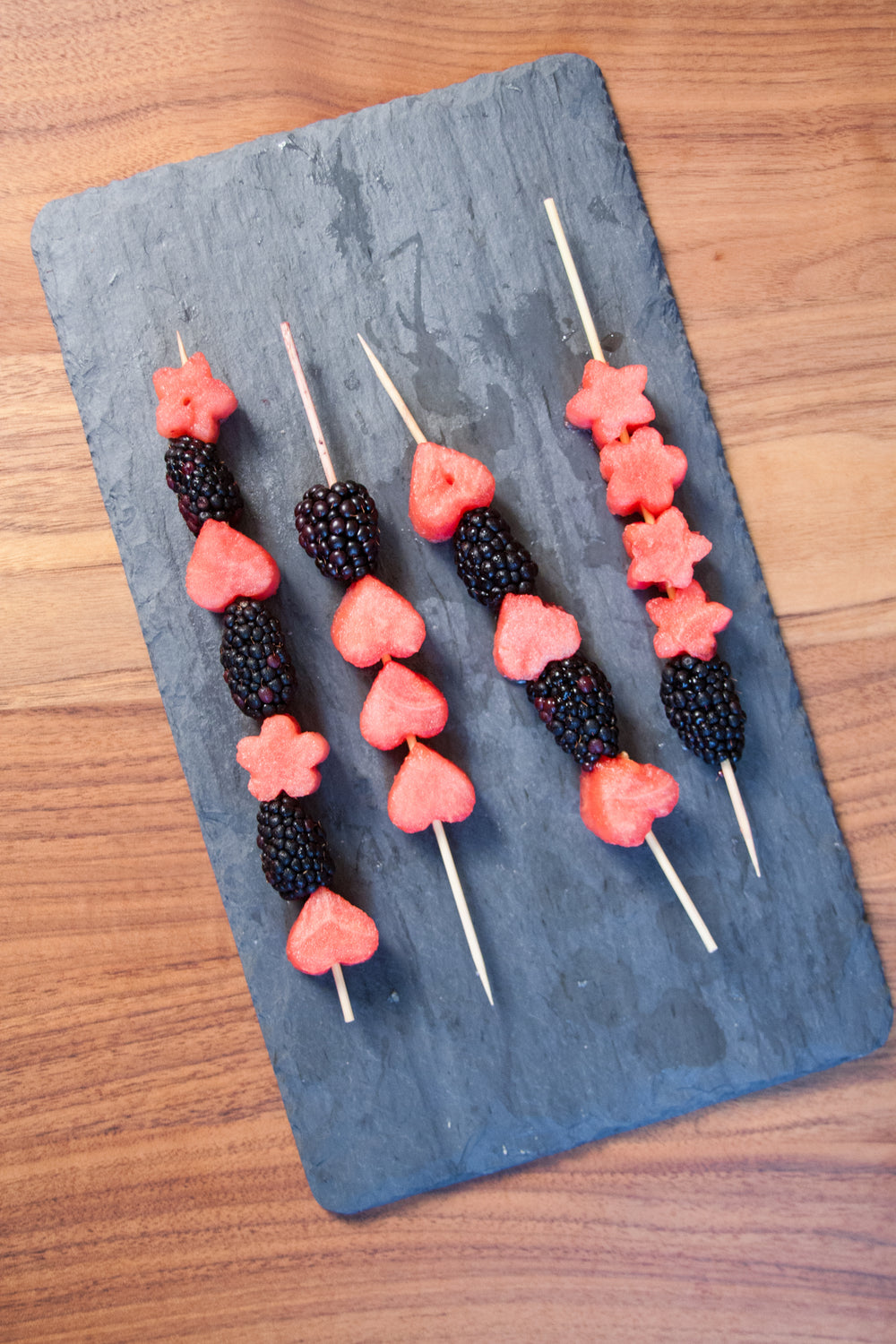 - Your kiddo can then thread the watermelon shapes and whole blackberries onto the kabob sticks.