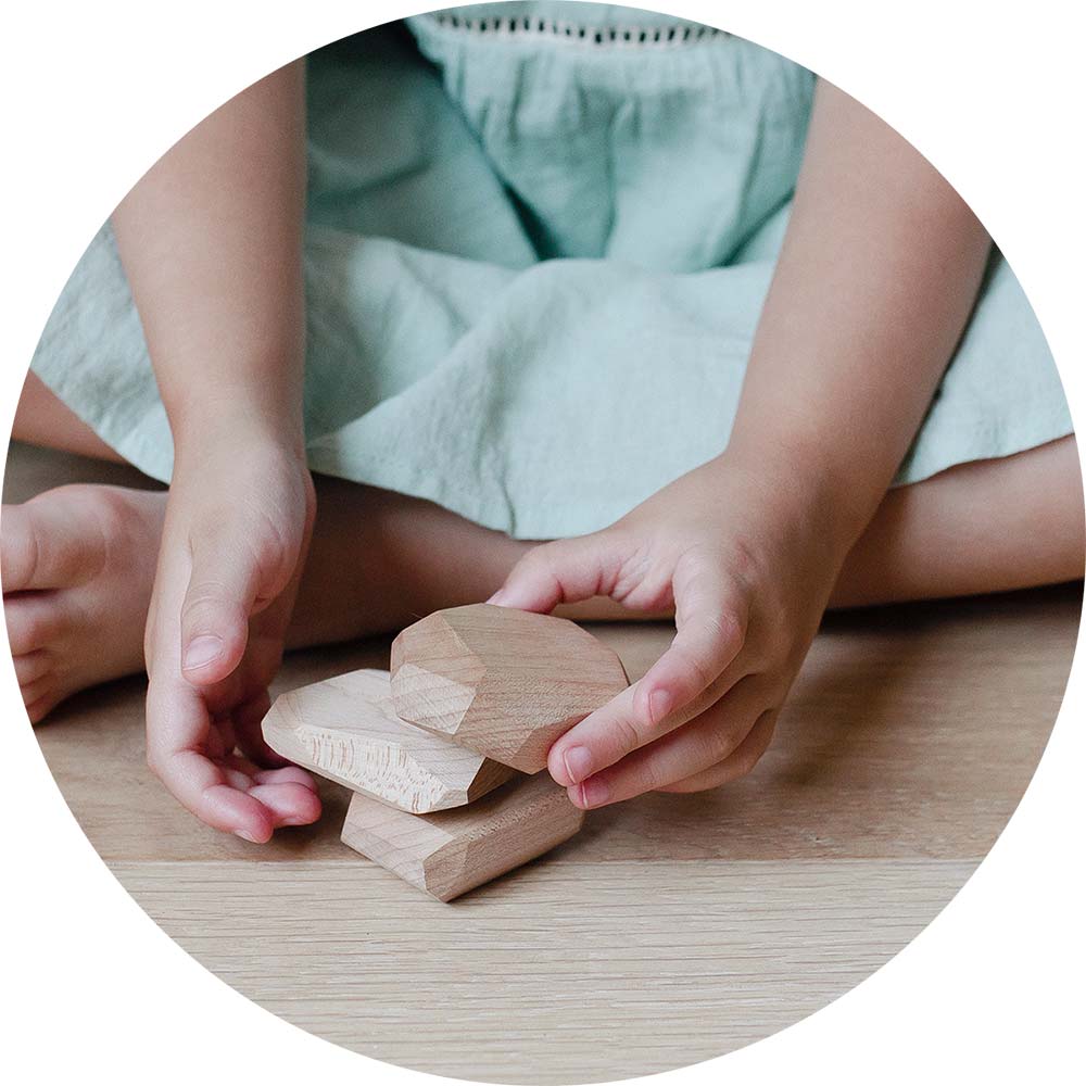 Kit includes: Maple wood stacking blocks with a natural oil finish, linen bean bag, play silk scarf, embroidered denim bag (9x6x3) and Calm Mind Exercise Cards